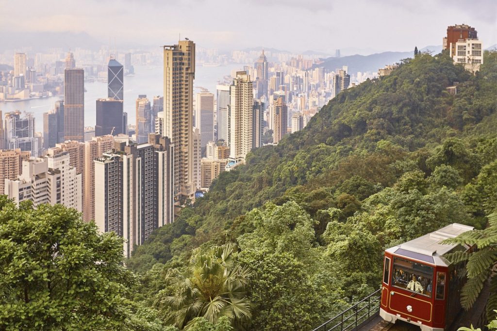 Crédit photo : Le tramway du pic, à l’horizon de Hong Kong. Les hôtels Hongkong & Shanghai.